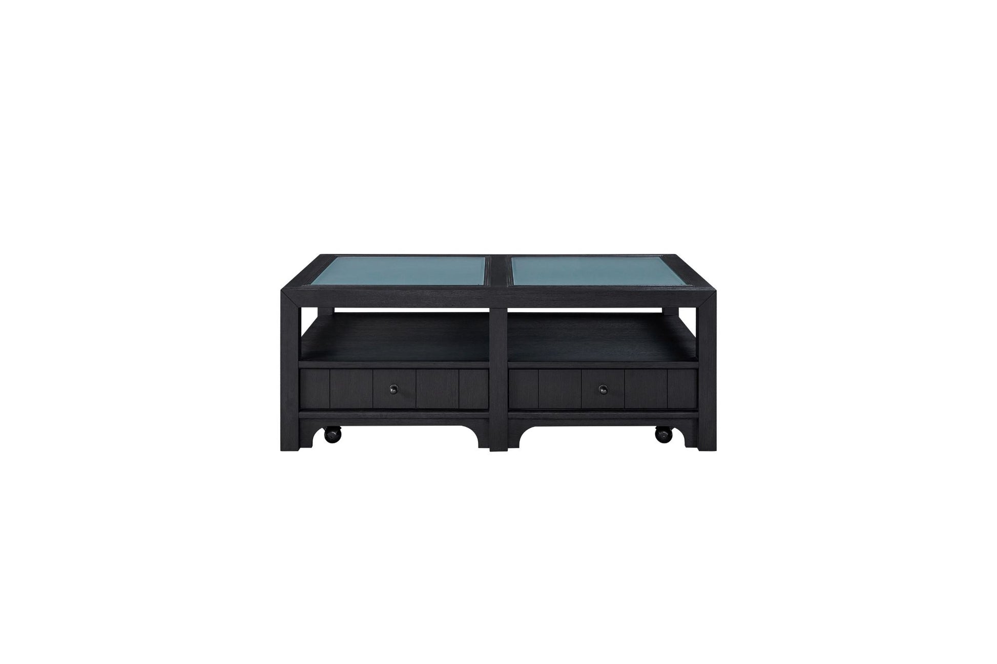 The Pleasant Hill Ebony Cocktail Table with Matte Glass Top brings modern elegance and practical storage to your living space. Its sleek matte glass surface adds a sophisticated touch, beautifully contrasting the rich ebony wood finish. Two drawers offer convenient storage for remotes and everyday essentials, while the open bottom shelf is perfect for books or decorative pieces. With clean lines and thoughtful details, this cocktail table makes a bold yet refined centerpiece for any room.