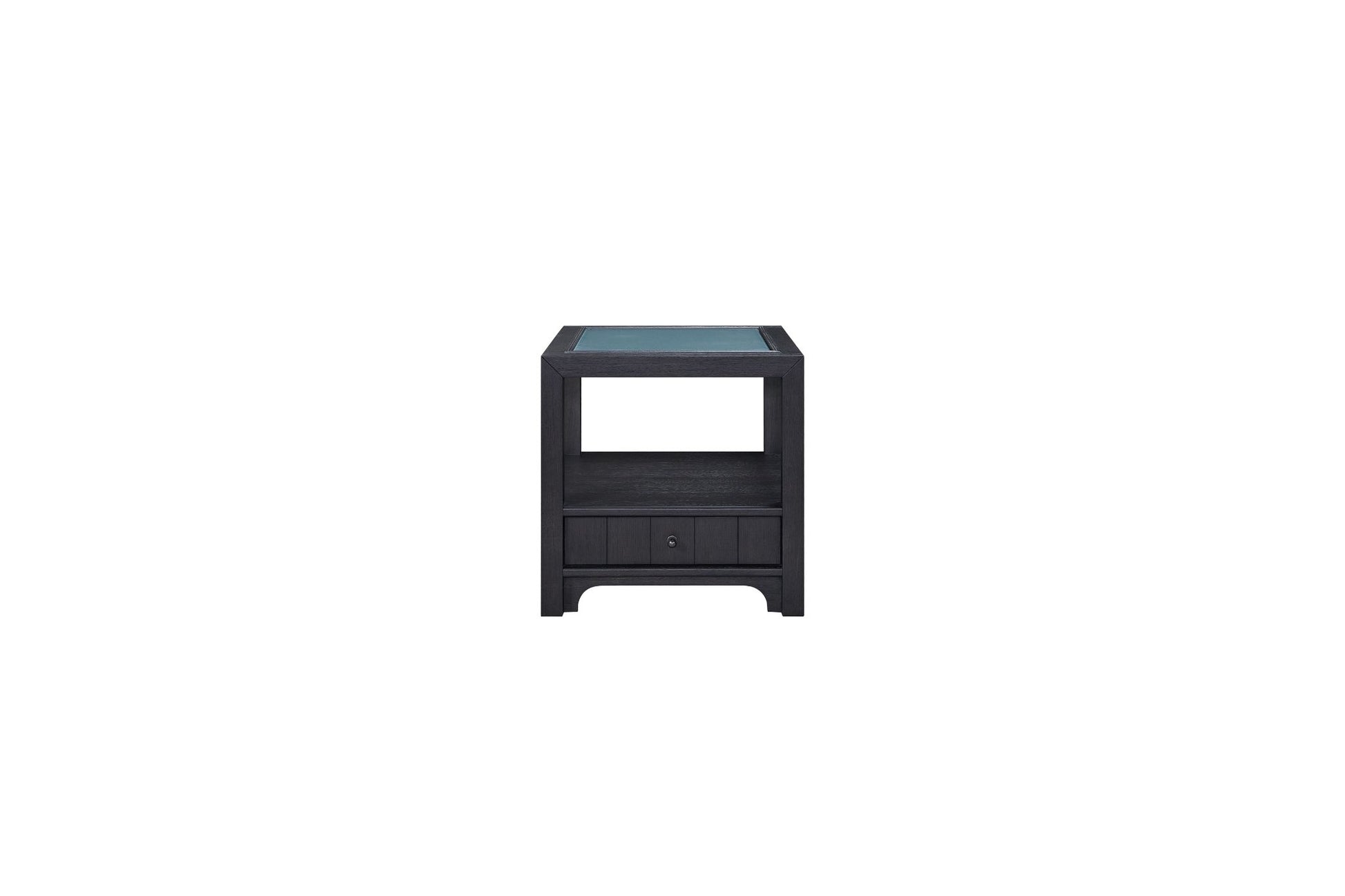 The Pleasant Hill Ebony End Table with Matte Glass Top offers a sleek and functional accent to any seating area. Its soft matte glass surface pairs beautifully with the deep ebony wood finish, creating a refined, modern look. A single drawer provides hidden storage for small items, while the open bottom shelf adds space for display or additional organization. Compact yet stylish, this table is the perfect complement to the matching cocktail table or a standalone statement piece.