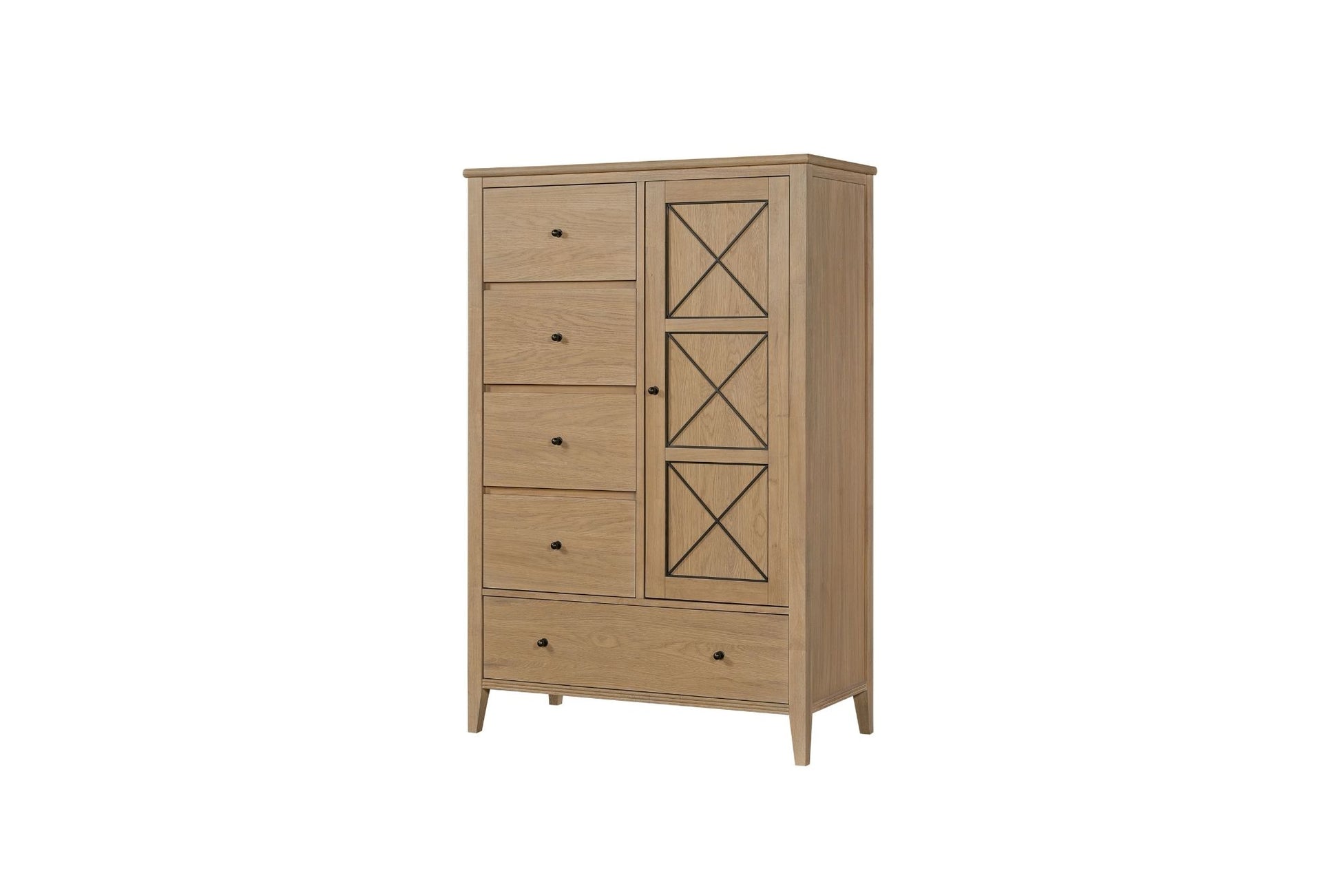 The Pleasant Hill Suede Door Chest offers a fresh blend of storage and style with its thoughtfully balanced design. Finished in a warm suede tone, this piece features four smaller drawers on the left, a spacious drawer at the bottom, and a door on the right for versatile organization. The door is accented with three bold black squares, each featuring a subtle X detail that adds visual interest and a unique design touch. Crafted from American white oak, this chest pairs natural texture with clean lines for a simply chic look. It’s a functional statement piece that elevates any bedroom with understated elegance.