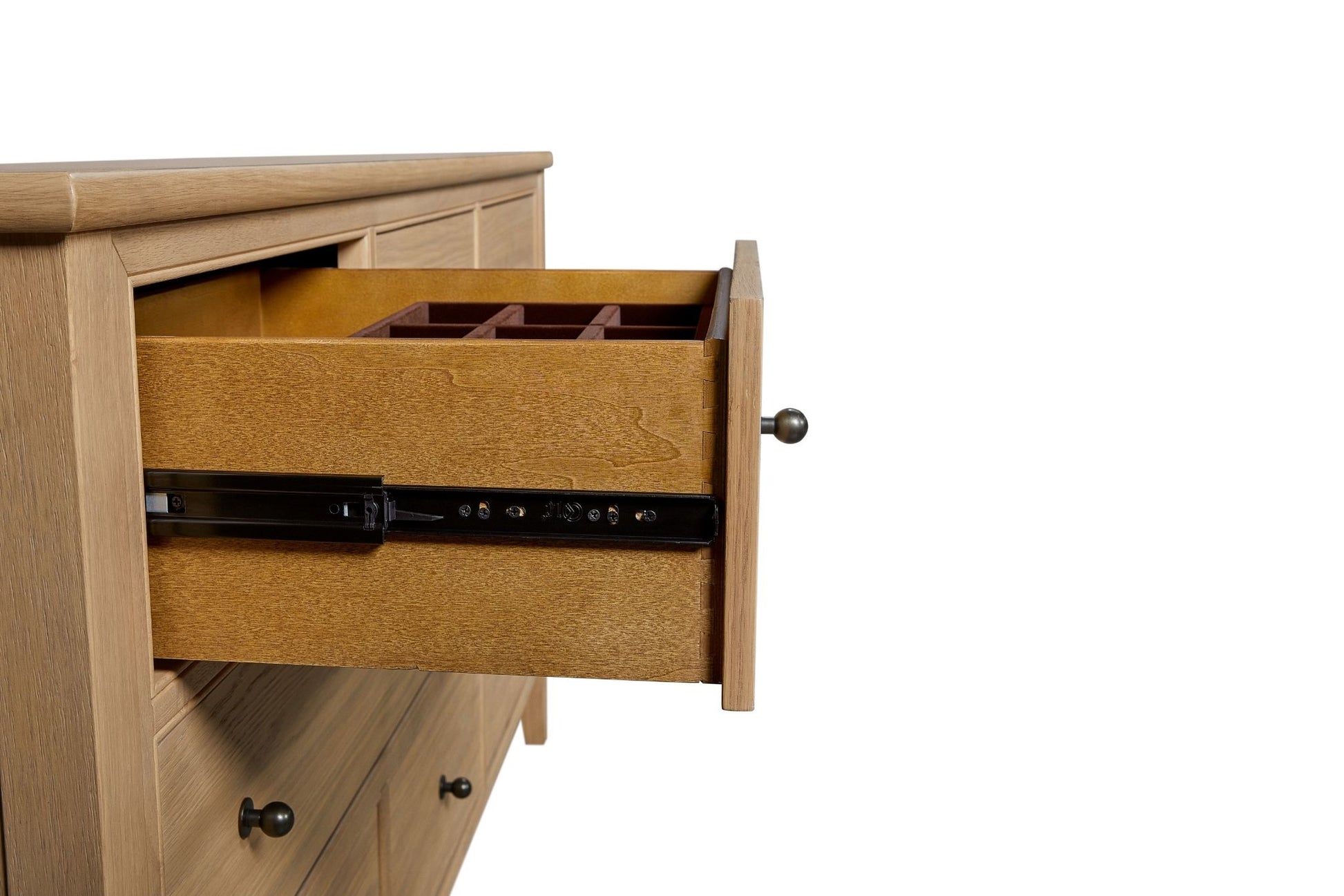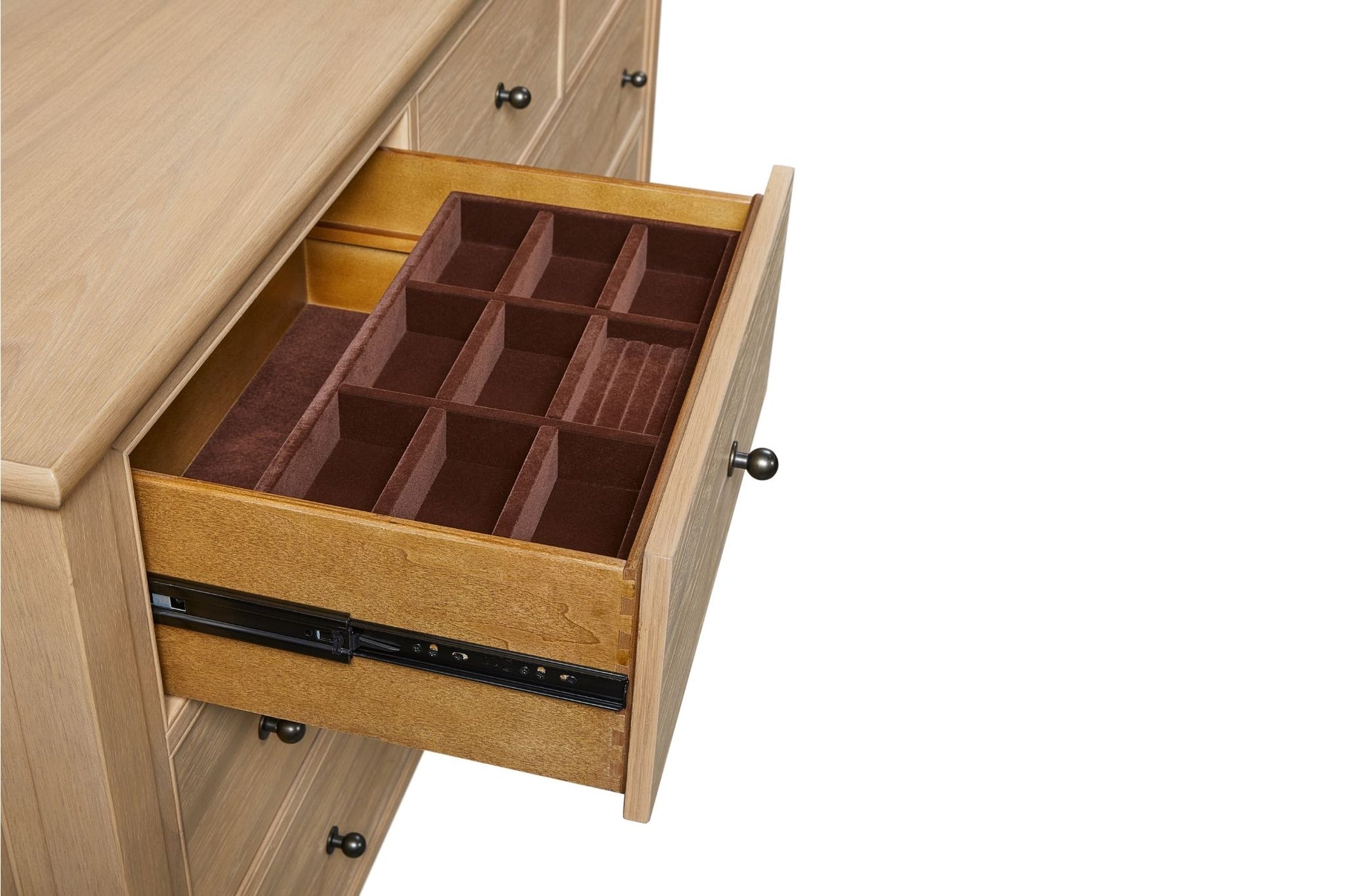 The Pleasant Hill Suede Dresser with Jewelry Box offers a perfect balance of style and storage with its warm, taupe-toned finish and graceful design. Crafted from American white oak, it features eight soft-closing drawers that provide generous space for wardrobe essentials. The top drawer is velvet-lined, creating a dedicated and elegant space for jewelry and smaller accessories. Subtle detailing, refined hardware, and a tall, slender profile bring a sense of quiet luxury to any bedroom. This dresser captures the collection’s simply chic aesthetic while adding both beauty and function to your space.